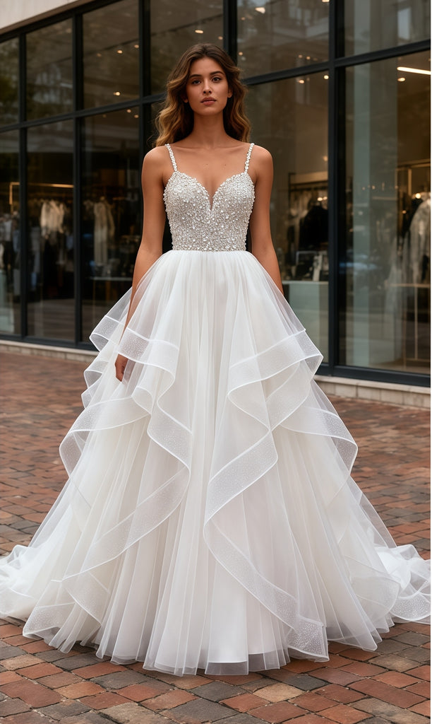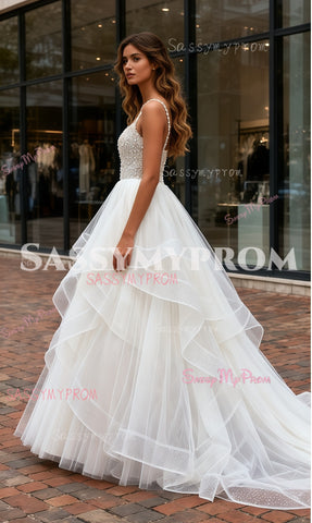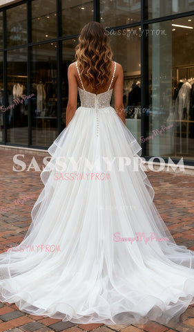 Beading A Line Ruffles Tulle Spaghetti Straps Wedding Dress