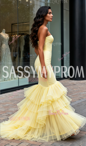 Satin Trumpet Mermaid Tulle Strapless Ruffles Prom Dress