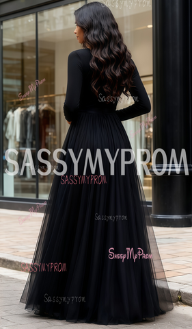 Scoop Long Sleeve A Line Black Tulle Prom Dress