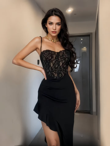 Balanced perfectly between elegance and sensuality, this dress combines a delicate lace bodice with a flowing satin skirt to create a stunning piece that’s ideal for both formal and semi-formal occasions. The bodice features intricate lace detailing, offering a sophisticated yet slightly daring look with its corset-style design. Complemented by the asymmetrical ruffle hem, this high-low skirt adds a modern touch to classic refinement. Whether you're attending a wedding, a cocktail event, or a formal dinner, this dress offers a flattering fit, thanks to its tailored waist and adjustable straps. With the ruffles providing both movement and visual interest, the dress creates an effortlessly glamorous vibe. Available in small, medium, and large sizes, it is designed to fit a range of body types, providing comfort and a silhouette that accentuates your natural curves.