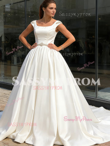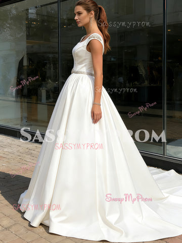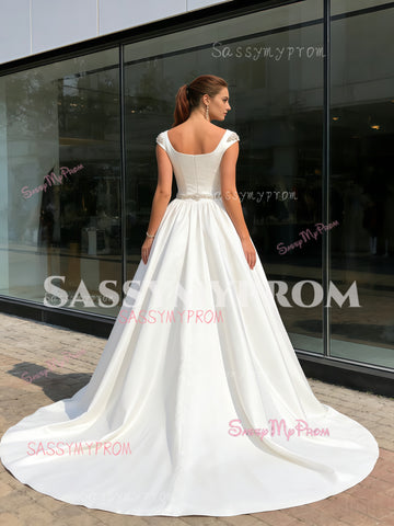 A Line Belt Short Sleeve Satin Square Beading Wedding Dress