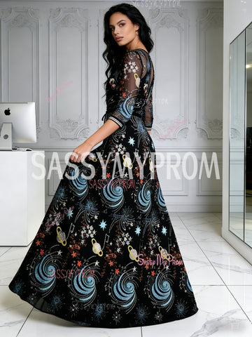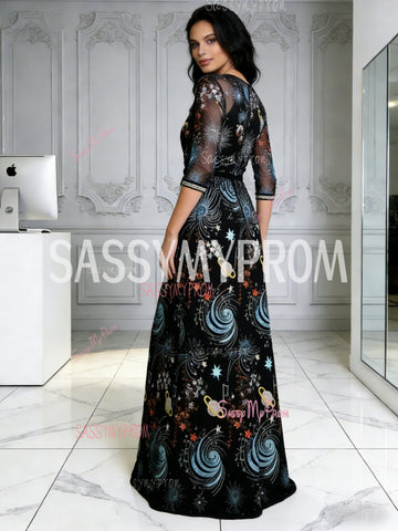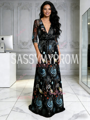 V Neck Half Sleeve Black Print A Line Prom Dress