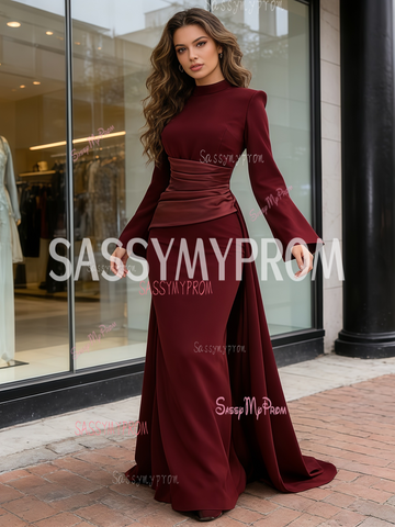 Satin Detachable Train High Neck Burgundy Trumpet Mermaid Prom Dress
