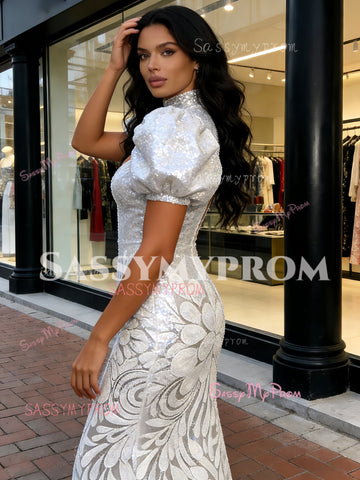 Trumpet Mermaid Silver Sequin High Neck Floral Prom Dress