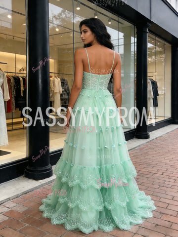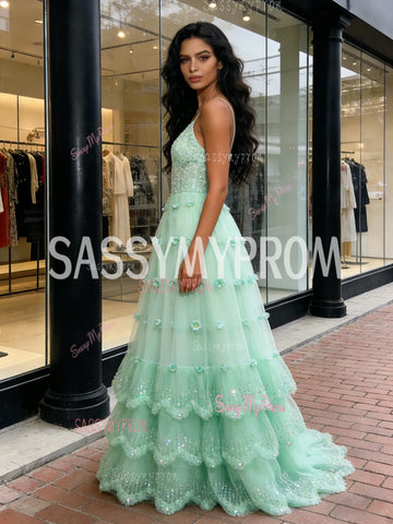 Tulle Green Ruffles A Line V Neck Sparkle Prom Dress