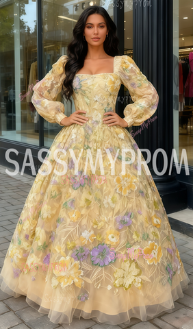 Bathed in a joyful light yellow tone, this gown brings the warmth of spring into the room. Opening with a gentle square neckline and airy puff sleeves, the design gives the upper body a soft, romantic frame. Flowing outward from the cinched waist, the skirt forms a stately silhouette that feels airy rather than formal. Blossoming across the tulle, raised floral embroidery in yellow, purple and white adds a lively sense of texture and freshness. Keeping the colors soft ensures the gown remains bright without becoming overly bold. Stepping out in this piece surrounds you with an easy brightness that feels uplifting and effortlessly charming.