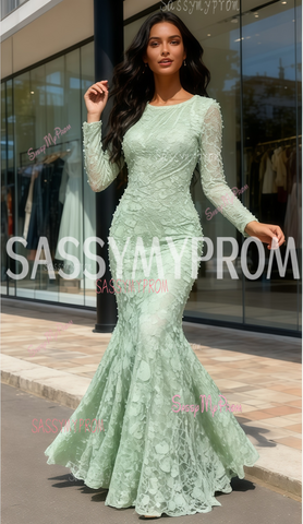 Mint Scoop Trumpet Mermaid Long Sleeve Flower Lace Prom Dress
