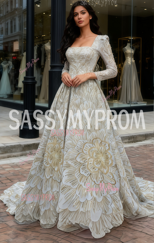 Adorned with a soft pale gold white glow, this gown creates an instant sense of quiet grandeur. Framing the shoulders with a vintage square neckline, the design then transitions into sheer sleeves that add a graceful, almost ethereal calm. Falling naturally from the cinched waist, the wide skirt moves with an airy sweep and finishes with a small trailing hem that glides behind you. Glimmering beadwork and tiny sequins form large floral motifs that shift gently under the light, offering shine without excess. Choosing lightweight layered tulle for the base keeps the entire silhouette soft and easy to wear. Wearing this piece feels like stepping into a serene field under moonlight, creating an atmosphere that lingers long after you walk into the room.