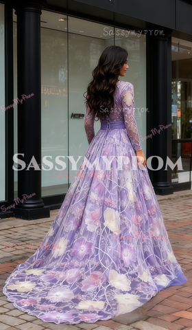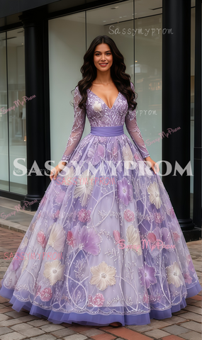 V Neck Beading Colorful Long Sleeves Purple Prom Dress