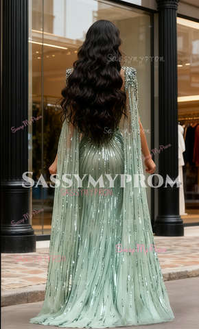 Beading A Line V Neck Long Sleeve Green Cape Prom Dress