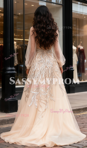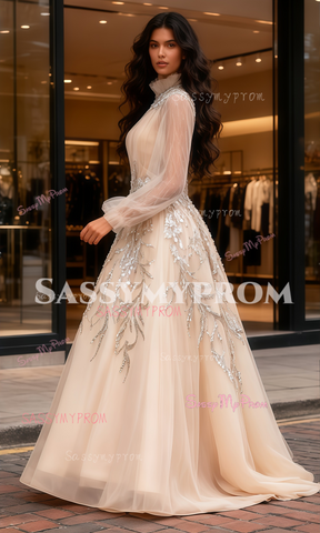 Champagne Tulle Appliques High Neck Long Sleeve Prom Dress