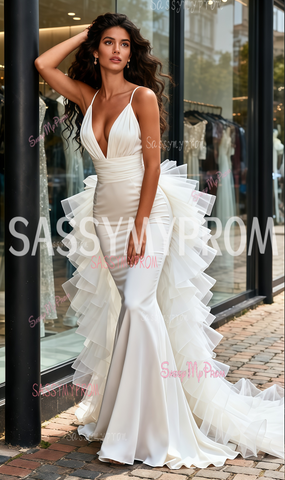 V Neck Satin Ruched Trumpet Mermaid Wedding Dress With Ruffles Train