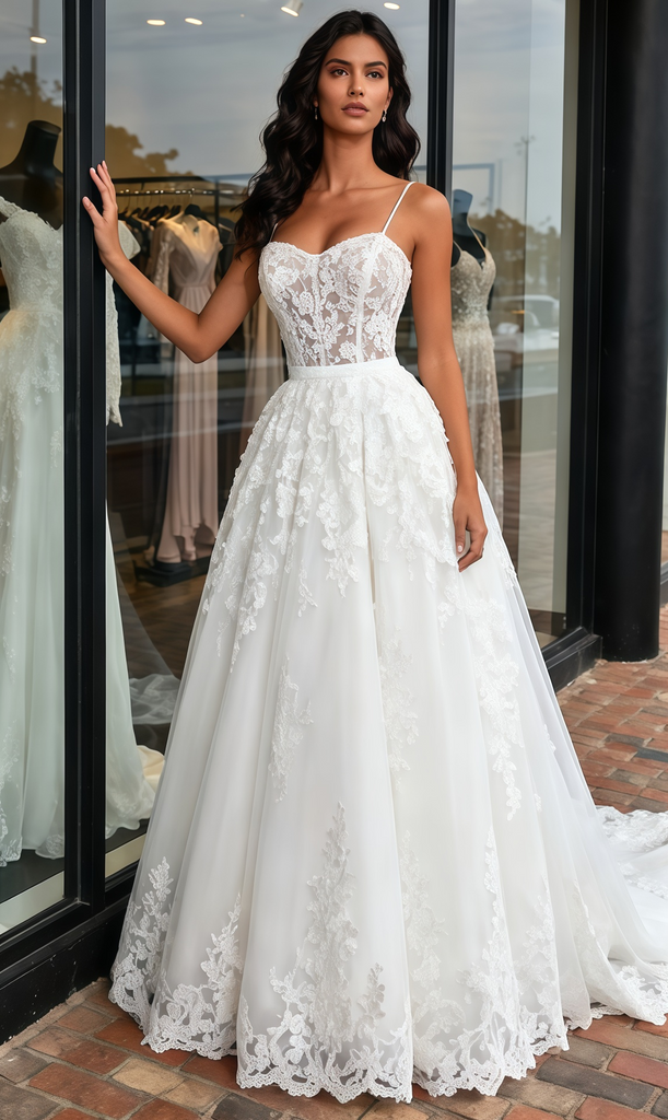 Spaghetti Straps Lace A Line Tulle White Wedding Dress