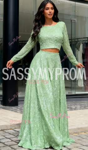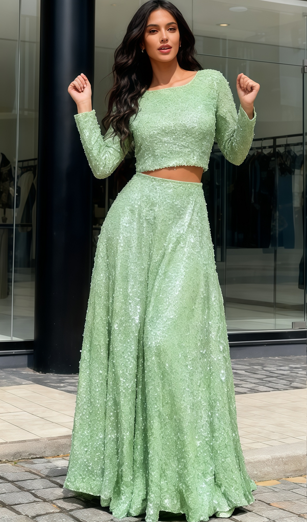 Luminelle offers a lively interpretation of a two piece sequin ensemble. A cropped long sleeve top sits at the narrowest point of the waist, creating a fresh and youthful outline. Below it, a high full skirt turns with smooth volume, carrying a field of fine silver and pale green sequins that brighten with every motion. The mixture of cool tones gives the fabric a sparkling lime tint that feels crisp rather than intense. Although the entire set is covered in shimmer, the color keeps the mood light and approachable. Each piece can be styled alone for day to day fashion experiments. The finished look is bright, spirited and full of playful charm.