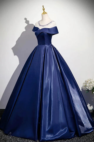 Long Scoop Beading A Line Navy Satin Prom Dress