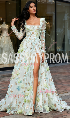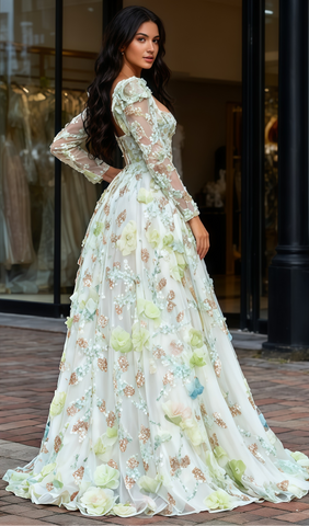 Aligning with romantic subversion, this dress offers a princess vibe with a contemporary twist, perfect for those seeking elegance with a bold cut.This white prom gown combines fairy-tale romance with modern edge. Delicate 3D floral appliqués cascade down the skirt, crafted from tulle and silk organza, while a high thigh slit adds movement and prevents a bridal look. The sheer long sleeves, lined with nude mesh, feature embroidery that mirrors the skirt's florals for visual harmony. A structured square neckline frames the shoulders beautifully. The lightweight tulle skirt ensures airy volume, and subtle gold threads on the floral edges catch light softly.