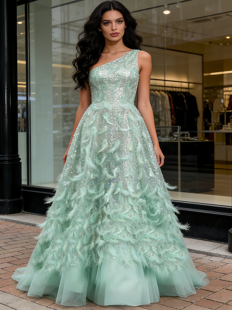 One Shoulder Green Feather A Line Sparkle Prom Dress