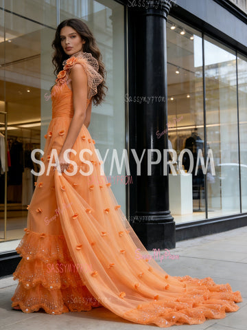 Ruffles Orange Tulle One Shoulder Sparkle Prom Dress
