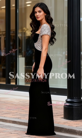 Short Sleeve Beading Trumpet Mermaid Black Prom Dress
