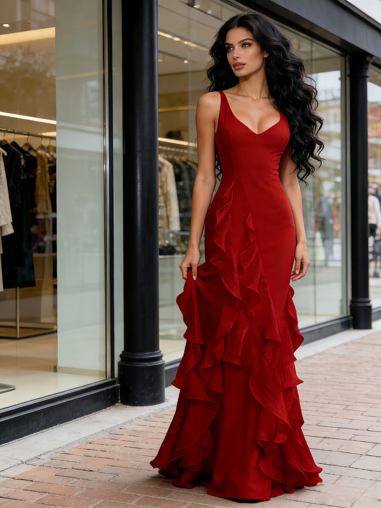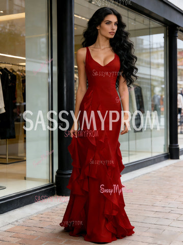 V Neck Sheath Column Chiffon Burgundy Ruffles Prom Dress