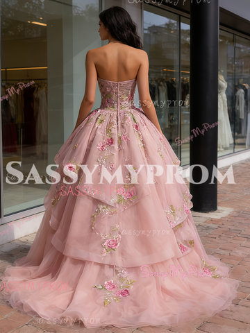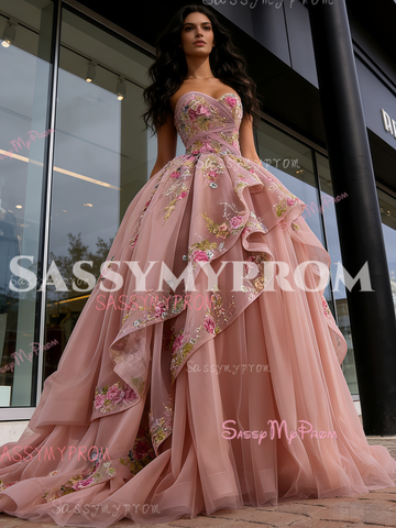 Tulle Ball Gown Ruffles Pink Sweetheart Appliques Prom Dress