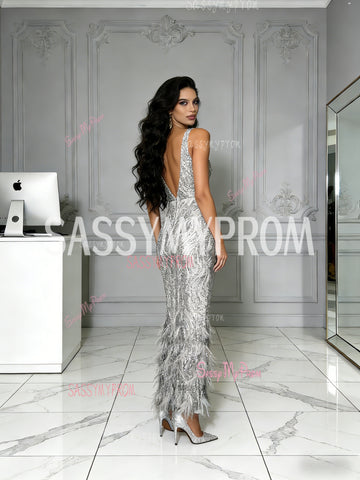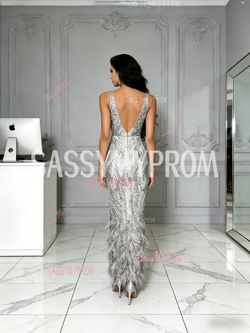 Sheath Column Silver Feather V Neck Ankle Length Prom Dress