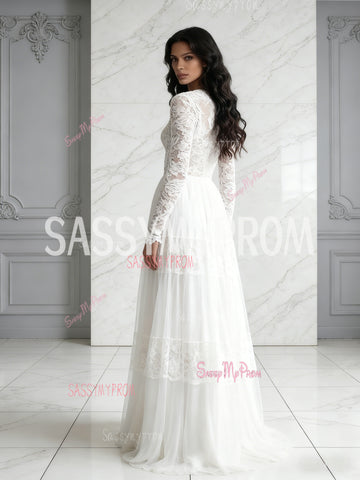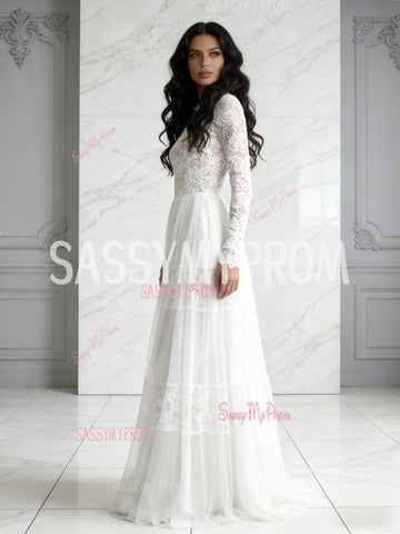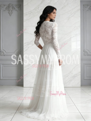Lace Scoop Long Sleeve White Tulle A Line Wedding Dress
