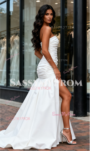 Satin Trumpet Mermaid Ruched Strapless Wedding Dress With Slit
