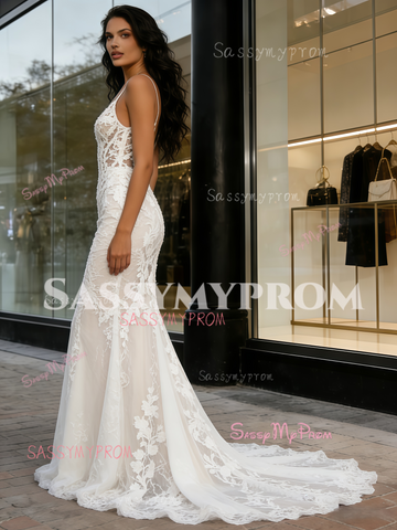 Sheer Lace Appliques V Neck Trumpet Mermaid Wedding Dress