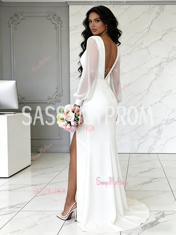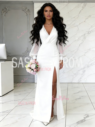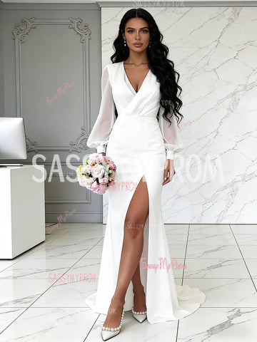V Neck Ruched White Chiffon Long Sleeves Wedding Dress With Slit