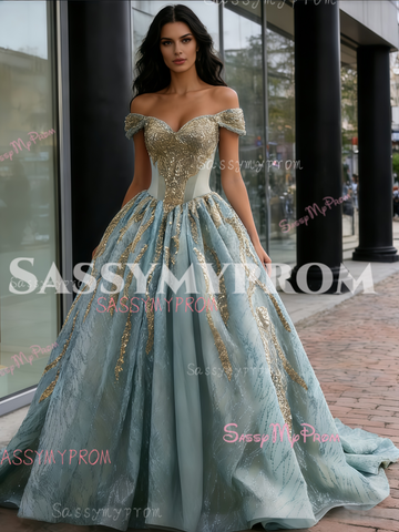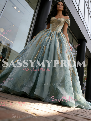 Appliques Ball Gown Green Off The Shoulder Tulle Prom Dress