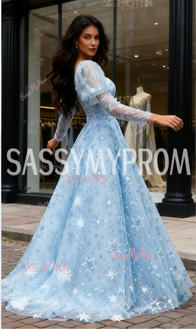 Blue Long Sleeve Tulle A Line Snowflake Prom Dress With Slit