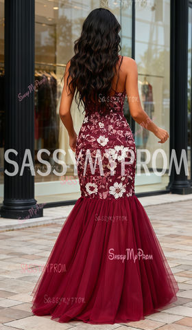 Shining in a rich wine red, this mermaid gown highlights the silhouette with confident elegance. Forming a deep V neckline supported by slim straps, the bodice follows the natural lines of the torso with smooth precision. Leading into a fitted shape, the skirt flares at the hem with gentle tulle layers that move freely as you walk. Decorating the fabric, white floral motifs stitched with subtle gleam bring balance to the deeper base and soften the dramatic shape. Keeping the floral design simple prevents visual heaviness and lets the color stand out. Wearing this gown enhances every curve with intention, creating a look that feels bold yet tastefully refined.