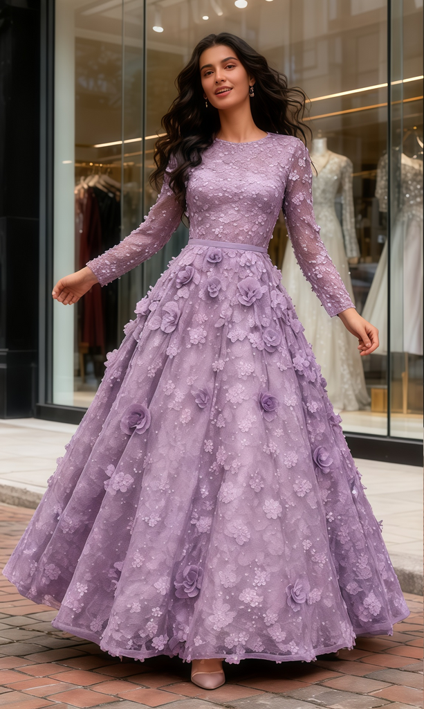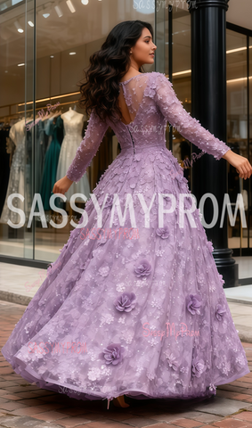 Long Sleeve Scoop Purple A Line Floral Prom Dress