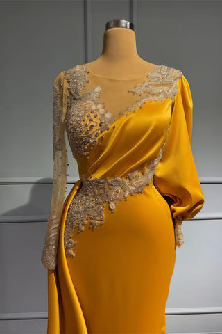 Long Sleeve Trumpet Mermaid Satin Gold Scoop Beading Prom Dress