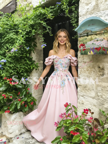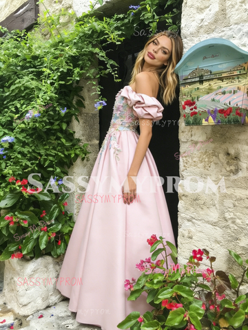 Off The Shoulder Satin A Line Appliques Pink Prom Dress