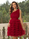 Shirred Waist Layered Hem Mesh Ruffles Party Dress